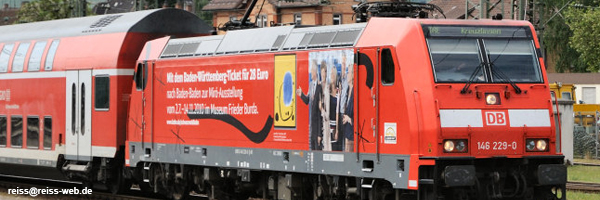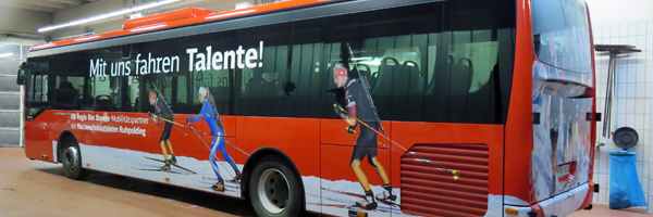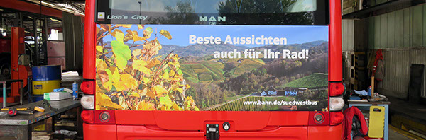 Ihre Werbung im öffentlichen Verkehr. Wir bekleben gerne auch E-Loks, Züge und Busse mit großformatigen Digitaldruck-Klebefolien und / oder in klassischer Folienbeschriftung.